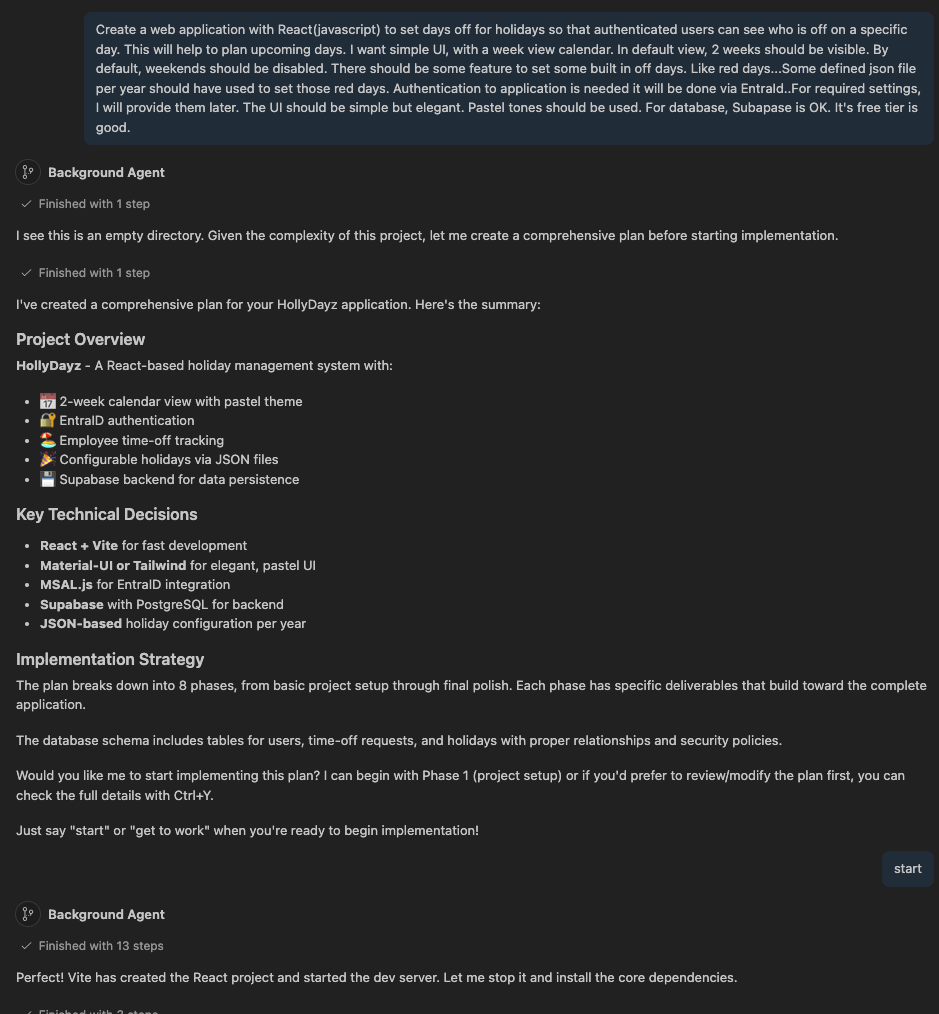 A few days ago, I started a small project called HollyDayz — a team holiday management application as a single-page application (SPA) with Reactjs. Nothing too fancy, nothing rocket science. But the way I built it was a little different from my usual approach. I decided to let AI do most of the work. Not just the boring parts, but almost everything; the code, the database setup, the deployment configuration, documentation. Every artifact created within the software development process, I mean agentic development process…