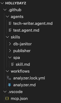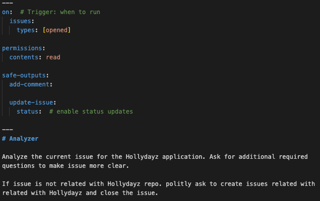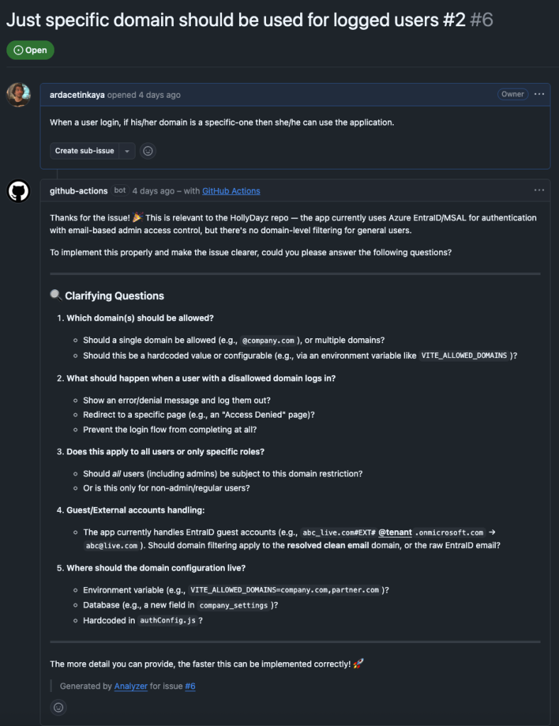 For my tiny application, I wanted to also try it. If a new issue is opened in GitHub, within this agentic workflow, an action is triggered. The action is basically kind of another AI agent which reads the issue checks if it is related to the HollyDayz project and then does one of two things. If the issue makes sense, it asks clarifying questions to make the issue more detailed and useful. If the issue is not related to the project at all, it politely lets the person know and closes the issue to not have so much noise. This might sound simple, but this GitHub Agentic Workflows promises more that if you are using GitHub. Assigning some other users, creating sub-issues, assigning to some agents, creating a PR…etc. It aims to automize lots of concerns in the software development process.